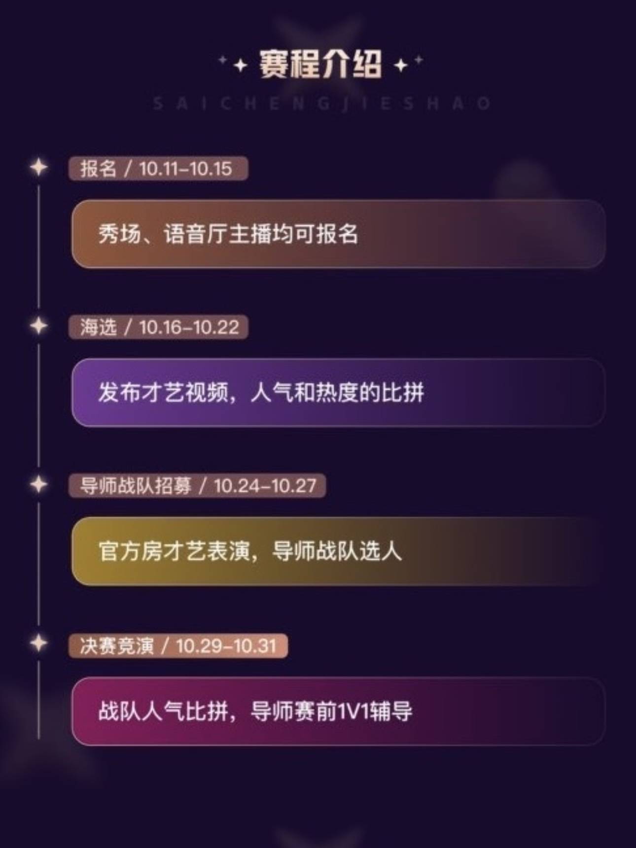 本届大赛将延续“闪耀唱将”与“闪耀舞王”双赛道并行的模式,无论你是能驾驭多风格曲目的实力歌者,还是擅长用肢体表达情绪的舞蹈达人,均可于10月11日到10月15日登录官方报名页参与角逐。赛事面向全平台主播开放,无资历门槛限制,只要心怀热枕,便能踏上逐光之路。